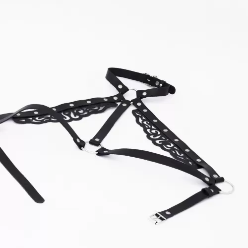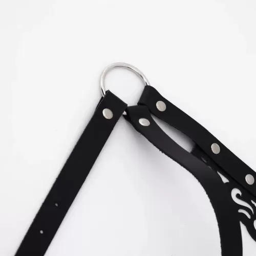 Эта резная портупея изготовлена из черной натуральной кожи и дополнена хромированной фурнитурой высокого качества. Ремешки соединены между собой кольцами и клепками. Благодаря большому диапазону регулировок портупея вели... Читать далее...