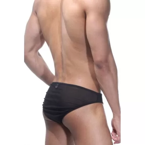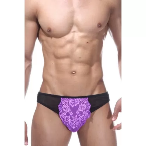 Черно-фиолетовые слипы для мужчин с низкой посадкой. На ягодицах и по бокам полупрозрачная черная тонкая ткань, а спереди яркая фиолетовая вставка из кружева... Читать далее...