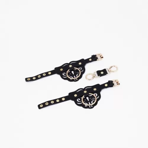 Наручники с декоративными резными узорами изготовлены из натуральной кожи. Декорированы золотой фурнитурой и клепками. В комплект также входит соединительный кожаный элемент с двумя карабинами, с помощью которого можно з... Читать далее...