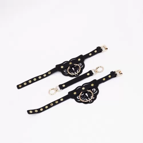 Оковы с декоративными резными узорами изготовлены из натуральной кожи. Декорированы золотой фурнитурой и клепками. В комплект также входит соединительный кожаный элемент с двумя карабинами, с помощью которого можно зафик... Читать далее...