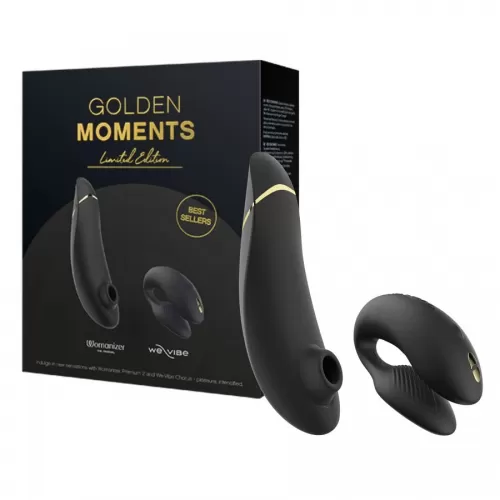 Набор для пар Golden Moments выполнен в черном цвете и состоит из Womanizer Premium 2 и We-Vibe Chorus.    Бесконтактный стимулятор клитора Womanizer Premium 2  Испытайте удовольствие с уникальной технологией Pleasure Air, которая позволяет стимулировать ваш клитор и испытать оргазм в считанные секунды – от мягких прикосновений до интенсивных всасываний в 14 разных режимах интенсивности. Функция Smart Silence чувствует ваше желание. Womanizer Premium начинает работать только при близком контакте с кожей и переходит в режим ожидания, стоит вам отложить его.  Вибратор для пар We-Vibe Chorus  Вибратор для пар от We-Vibe с интуитивным управлением - забудьте о кнопках, просто сжимайте сенсорный пульт в ладони, чтобы увеличить силу вибрации. Chorus имеет 10 встроенных режимов и бесконечное количество настраиваемых - вы можете создать любой рисунок вибрации в приложении We-Vibe и управлять вибратором с помощью смартфона. Chorus полностью водонепроницаемый, покрыт безопасным силиконом и изменит свою форму, чтобы стать удобным именно для вас. Длина Womanizer Premium 2 - 15,5 см. Размеры We-Vibe Chorus - 7,8 х 3,3 х 4,35 см