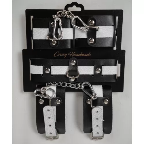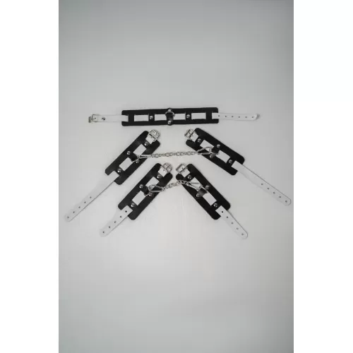 В набор входит ошейник, наручники и оковы. Доставляется в фирменной упаковке в виде брендированной деревянной подложки. Ошейник состоит из двух элементов: основа прямоугольной формы из натуральной кожи черного цвета и ремешок белого цвета с прочной хромированной фурнитурой в виде овального кольца. Расположение ремешка через прорези основной части является декоративным решением, а также служит для лучшей регулировки размера. Наручники состоят из двух деталей: основа прямоугольной формы из натуральной кожи черного цвета и ремешок белого цвета с прочной хромированной фурнитурой в виде овального кольца. Расположение ремешка через прорези основной части является декоративным решением, а также служит для лучшей регулировки размера. В комплект входит соединительная цепочка с двумя карабинами. Оковы состоят из двух деталей: основа прямоугольной формы из натуральной кожи черного цвета и ремешок белого цвета с прочной хромированной фурнитурой в виде овального кольца. Расположение ремешка через прорези основной части является декоративным решением, а также служит для лучшей регулировки размера. В комплект входит соединительная цепочка с двумя карабинами. Длина ошейника - 47 см, ширина - 5,5 см, обхват - 34-44 см. Длина наручников - 25 см, ширина - 6 см, обхват - 15-22 см. Длина оков - 32 см, ширина - 6 см, обхват - 20-29 см